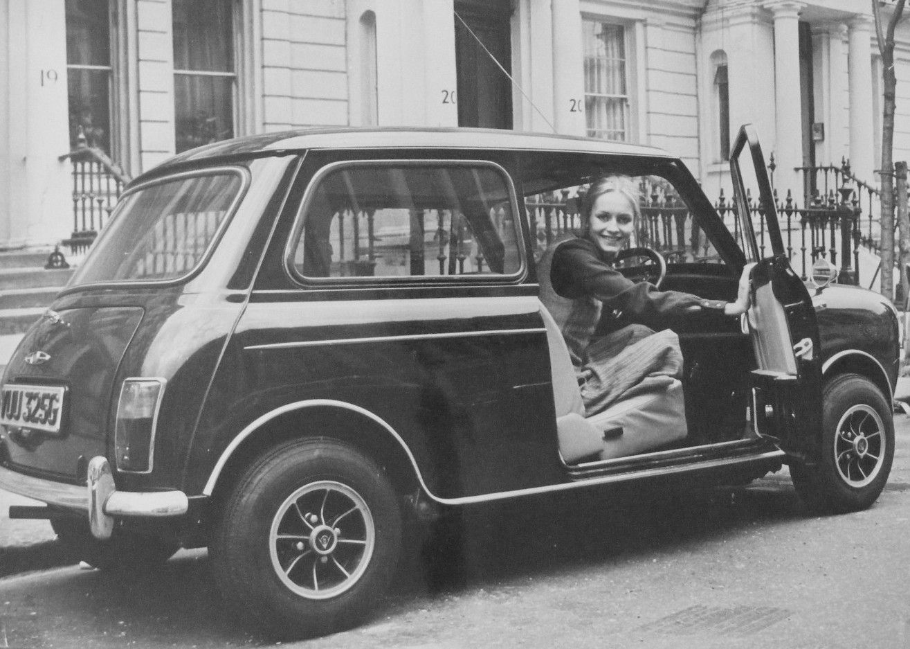 Twiggy was a British cultural icon and a prominent teenage model in the swinging sixties. Whenever her name is mentioned, people think of mini skirts, brightly patterned dresses and a cropped short ‘mod-style- haircut. So is it very appropriate that she drove another sixties icon, the Mini Cooper ‘S’. Twiggy’s association with the Mini was reborn in a 2007 Marks & Spencer advert. In the promotion, Twiggy and several other models are filmed and photographed alongside a 1960 Morris Mini repainted in pink with large pale flowers.
