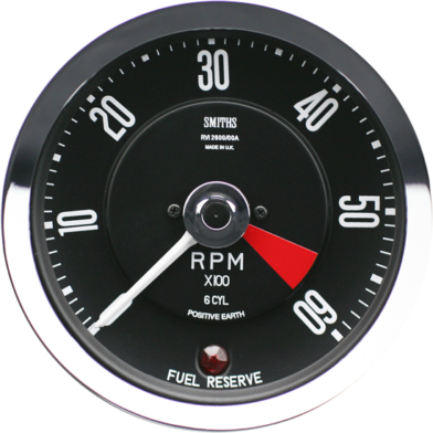 Smiths Classic 100mm 0-6000RPM black face Tachometer for the Aston Martin DB5. Chrome bezel, SMITHS logo, white print and Fuel warning light.