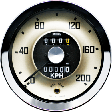 100mm diameter Austin Healey 3000 Speedometer with gold dial, black print and half V chrome bezel. with strap fixing, floodlit illumination and high beam warning light. Available in KMH and MPH scale.