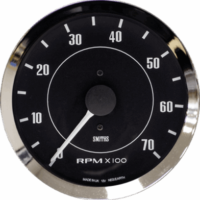 Smiths Classic electric Tachometer. 12 volt, black dial, floodlit illuminated with chrome bezel.
