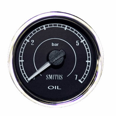 Smiths 52mm classic flight oil pressure 7 Bar Compatible with sender unit PTTR2300-10-8NKIT 0-5v.  Half round chrome bezel as standard. White pointer, print and plastic case. 260° FSD