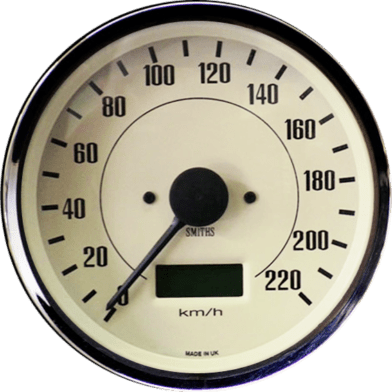 100mm Programmable Stepper Speedometer with magnolia dial, black print and black pointer. Available with Full ‘V’ chrome bezel or half round (IVA)