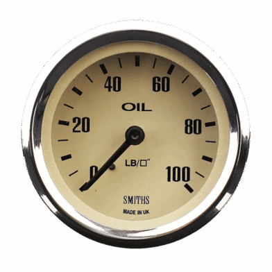 Mechanical Oil pressure gauge 0-100 psi with white internal illumination and chrome bezel. 270° FSD