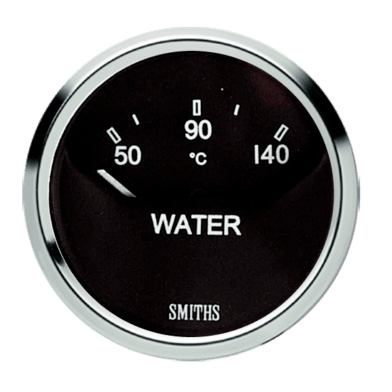 Cobra 52mm electronic water temperature gauge with SMITHS logo. 70° sweep, 50-140°C  Floodlit illumination. Available in full v or 1/2 round chrome bezel.