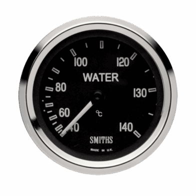 Smiths Classic mechanical 52mm water temperature gauge. 140°C 7/8 inch capillary. Black dial, white print and pointer. Available in full v or 1/2 round chrome bezel.