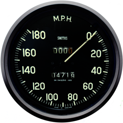 SMITHS 180MPH Speedometer in aged white print, black dial with aged white pointer. Black machined billet case and powder coated black full vee bezel. The SMITHS Logo and original SMITHS product number is also printed on the dial.