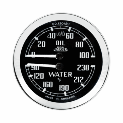 52mm dual oil and water gauge with black dial, white print and half V chrome bezel. 0-100psi, 90-230°F Jaeger logo. Also available 30-110°C
