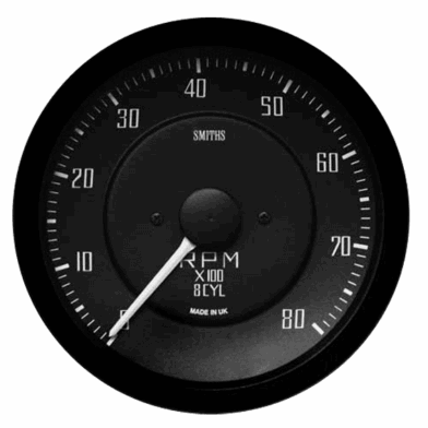 Smiths New 100mm (4in) 8K stepper speedo for the GT40, black dial with half vee black bezel, white pointer and white print.12 volt and 3 watt bulb. Easy setup allows for engines up to 12 cylinders