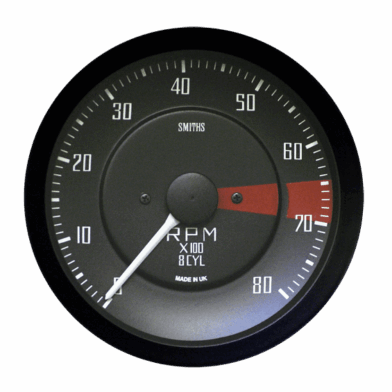 Smiths Classic digital 100mm tachometer for the GT40, easy setup allows for engines up to 12 cylinders. 1/2 V black bezel, black dial and white print. Red sector at 6.5 – 7k. 12volt, 3 watt bulb.
