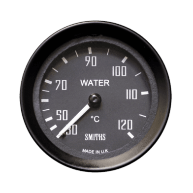 Smiths Classic 52mm (2in) dashboard fit gauge for the GT40. Black dial with white print and black half V bezel. 30-120°C. Strap fixing. K type bulb.
