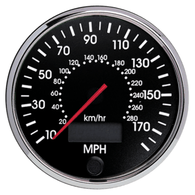 With black dial, white print, chrome full ‘V’ bezel and red pointer. Available in MPH and KMH scale.