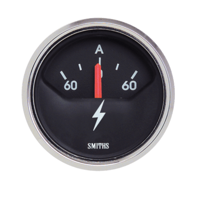 52mm gauge with dial, white print, red pointer and chrome full ‘V’ bezel. 12V. White illumination. With SMITHS logo.