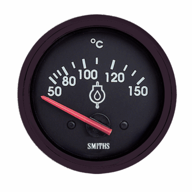 52mm oil temperature gauge with black dial, white print, red pointer and black full ‘V’ bezel. 12Volt