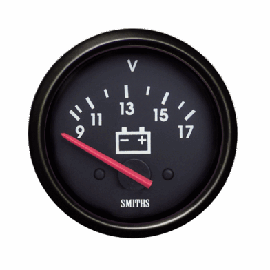 52mm voltmeter with black dial, white print, red pointer and black full ‘V’ bezel. SMITHS logo on dial.