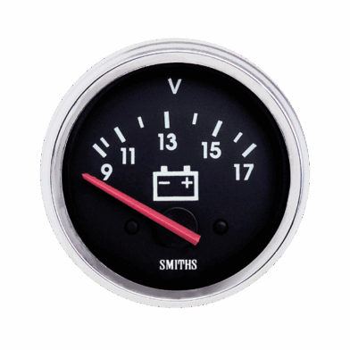 52mm voltmeter with black dial, white print, red pointer and chrome full ‘V’ bezel. SMITHS logo on dial.