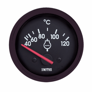 52mm Water temperature gauge with black dial, white print, red pointer and black full ‘V’ bezel. 40-120°C
