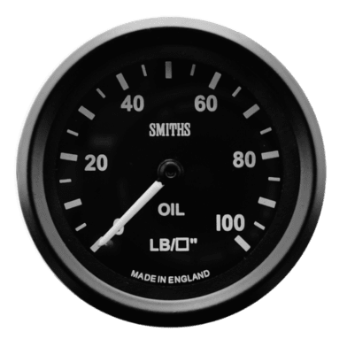 52mm mechanical oil pressure gauge for the Jaguar C Type. 0-100psi gauge with black FSD dial, black full vee bezel, beige print and pointer. With external illumination and strap fixing.