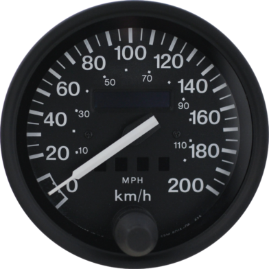 100mm waterproof speedometer with black dial and black stainless steel bezel. With push reset. Available in KMH or MPH scale.