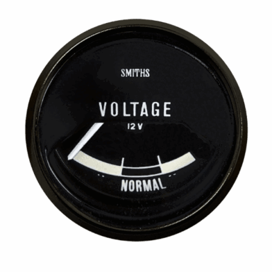 52mm Range Rover Series1 Voltmeter with black dial, white print and full ‘V’ black or stain black bezel. 12v with SMITHS logo on shroud.