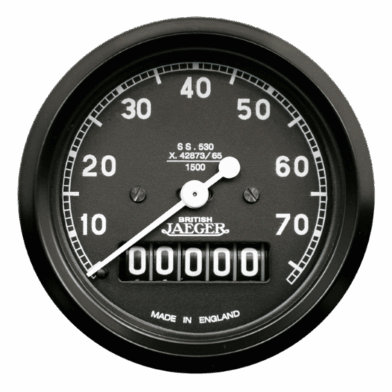 60mm non trip speedometer with black dial and full ‘V’ black bezel. Strap fixing.
