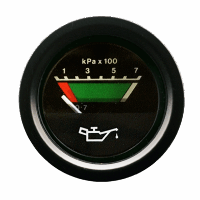 52mm waterproof oil pressure indicator with black dial, green white and red print and green internal illumination. 0-7 kpa X 100. 24 volt. Strap fixing. Earth return
