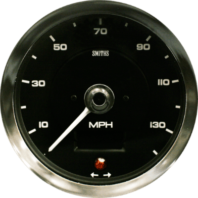 Lotus Elan Mark 2 140 MPH Speedometer with electronic movement. Remote Reset 1/2 vee chrome bezel, orange warning light. Pointer with chrome embellishment. Black dial, white print, Lotus font