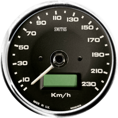 Black dial with white print, half round chrome and black bezel. White pointer with chrome centre. Available in KMH or MPH scale.