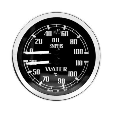 52mm dual water temperature and oil pressure gauge with SMITHS Logo. Chrome half V bezel, black dial and white print. Oil pressure 0-100psi, water temperature scale 90-230°F or 30-110°C. A2 type bulb
