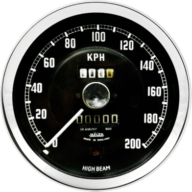 100mm (4in) 0-200KMH mechanical speedometer for the MGA with half V chrome bezel,l black dial, white print, moulded white pointer with pure aluminium centre. Remote trip, clockwise rotation, strap fixing, flood lit illumination and high beam warning light. 900Revs