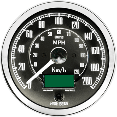 Dual 120 MPH / 200 KMH remote trip electronic speedometer with black dial, white print and white pointer. Half ‘V’ chrome bezel, high beam warning light and SMITHS logo.