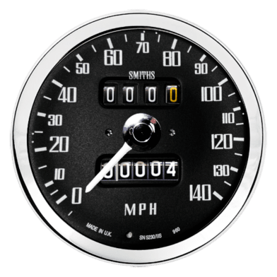 Smiths 80mm Mechanical Speedometer with chrome half ‘V’ bezel, black dial, white print and white pointer. Available in MPH or KMH. Floodlit illumination and remote trip. Clamp Fixing.