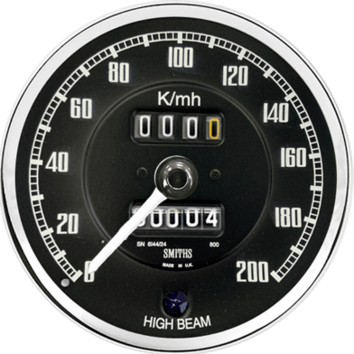 100mm Mechanical Speedometer with black dial , white print and white pointer and half ‘Vee’ chrome bezel. Available in MPH, and KMH scale. Floodlit illumination and remote trip.