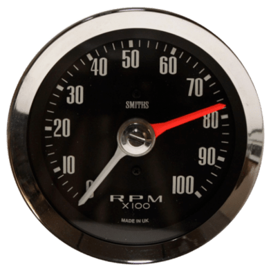 Smiths Mini Cooper / Cooper S 80mm ‘Max Hand’ programmable Tachometer with SMITHS logo, white pointer and red/orange hand. Available in magnolia or black dial with Full or 1/2 V bezel. Linear scale.