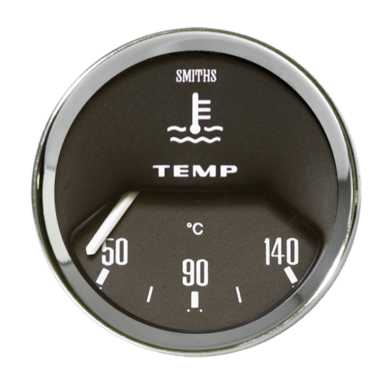 Smiths Classic 52mm electrical water temperature gauge. 50 -140°C. Available in black dial with  1/2 ‘V’ chrome bezel or magnolia dial with full ‘V’ chrome bezel. White internal illumination .Anti clockwise, blade connection and fixing strap