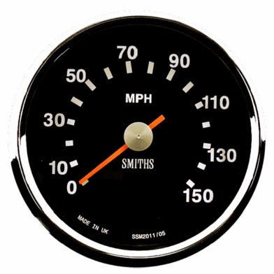 Smiths Classic black face 82mm (3in) Speedometer with odo or trip readout and onboard “drive-to-set” programming. Will fit original Smiths mounting brackets. Features our new billet case and is waterproof to IP 67. Available in MPH and KMH Scales