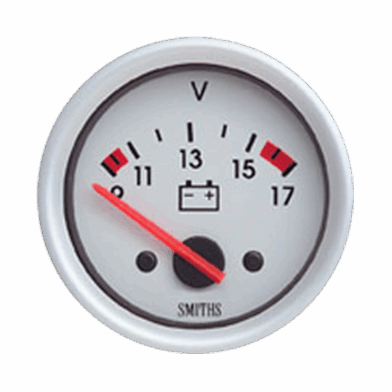 52mm Motorsport Voltmeter with cirrus white dial, black print with red sectors and red pointer. Aluminium 1/2 round bezel.
