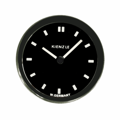 Triumph Stag mark2 52mm analogue clock with centre reset, black dial and white bold print. Half ‘V’ chrome and black bezel.