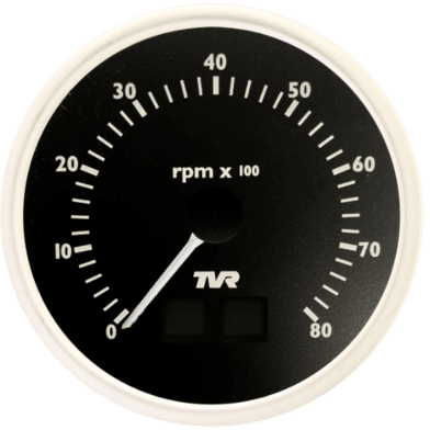 Electronic 100mm (4in) dashboard fit 0-8000 RPM for TVR Cerbera, Griffith and Chimaera. With warning lights and solid logo. Available with black, magnolia, mint green or cirrus white dial. This tachometer is programmable for number of cylinders