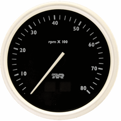 Electronic 100mm (4in) dashboard fit 0-8000 RPM for TVR Cerbera , Griffith and Chimaera. With warning lights. Striped logo, available with black magnolia or cirrus white dial. This tachometer is programmable for a number of cylinders