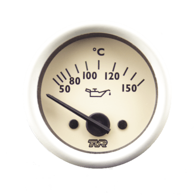 Oil temperature indicator available with black, magnolia or cirrus white dial.  Half round aluminium bezel. 15-150°C