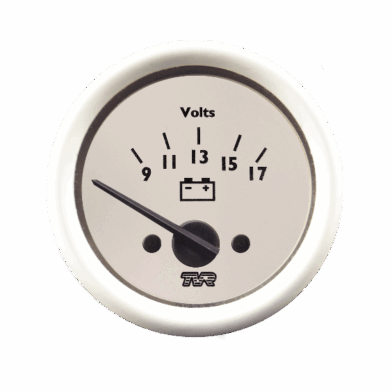 52mm Voltmeter with half round aluminium bezel. Available with Black, Magnolia, Mint Green or Cirrus White dial. 9-7 volts