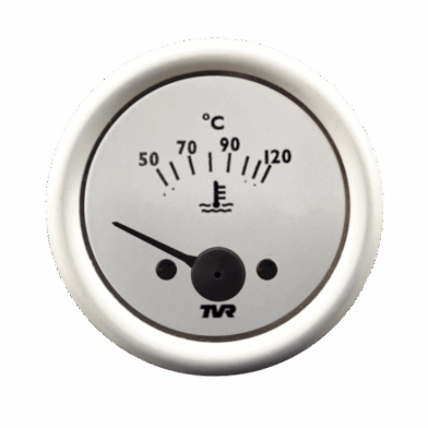 52mm 12v Water Temperature Gauge with solid logo, half round aluminium bezel and black rubber slip ring. Available with magnolia, black, mint green or cirrus white dial.