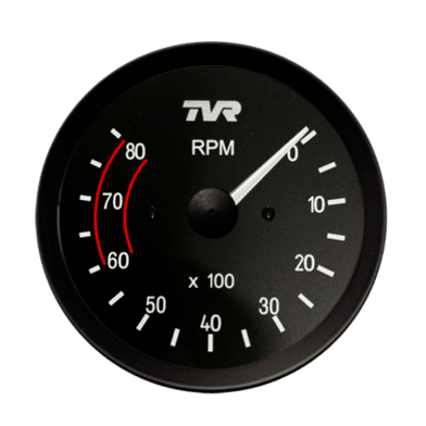 80mm 8K Tachometer for the TVR S4 with half ‘V’ black bezel and black dial. Red sectors at 6K to 8K