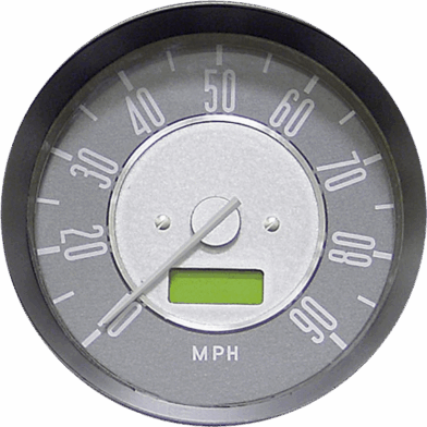 VW 120mm digital bay-window type speedometer with grey dial and inner silver centre. Instructions and templates supplied to existing panel, odo or trip readout, onboard “drive-to-set” programming, available in Mph and Kmh,